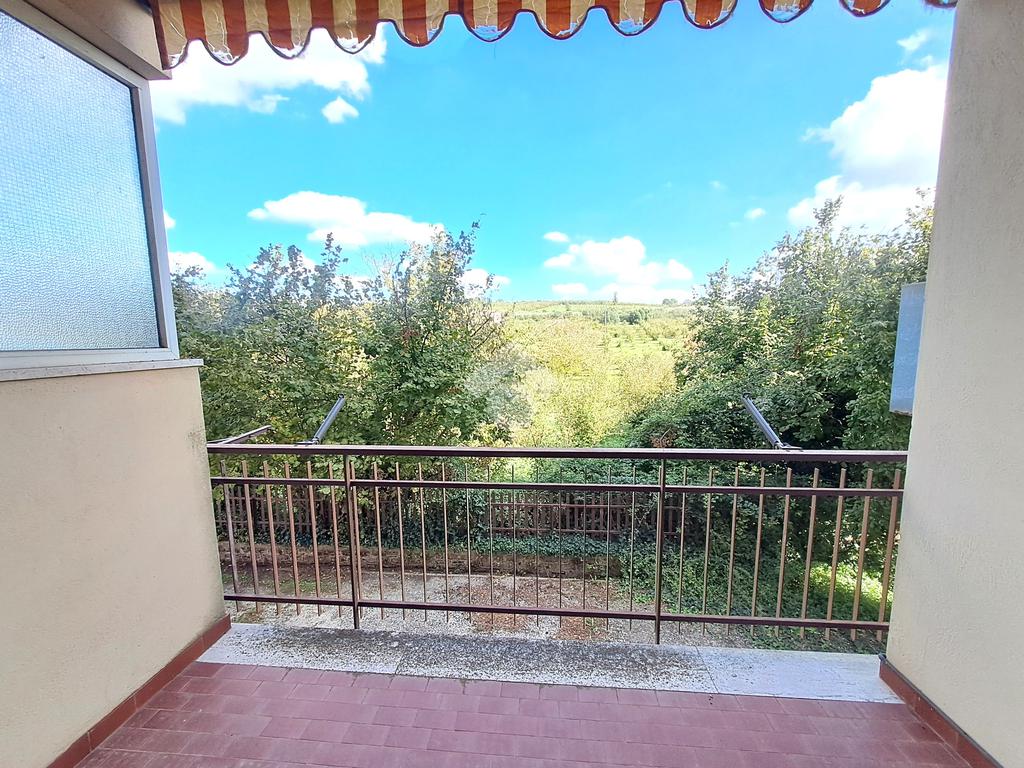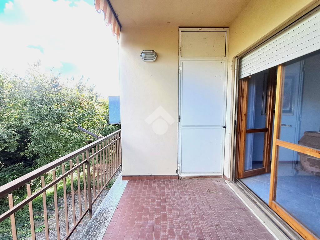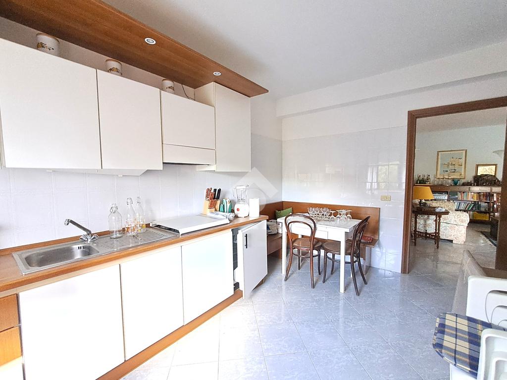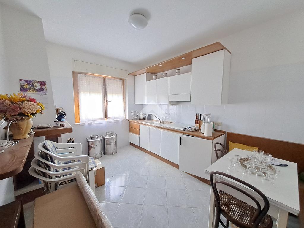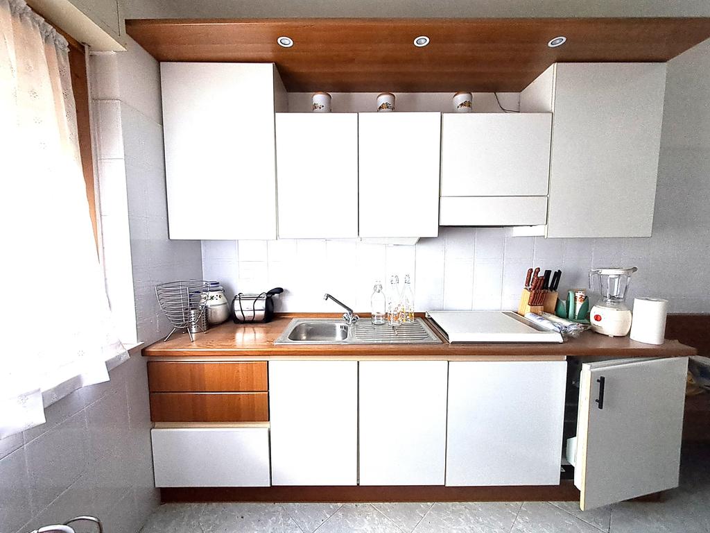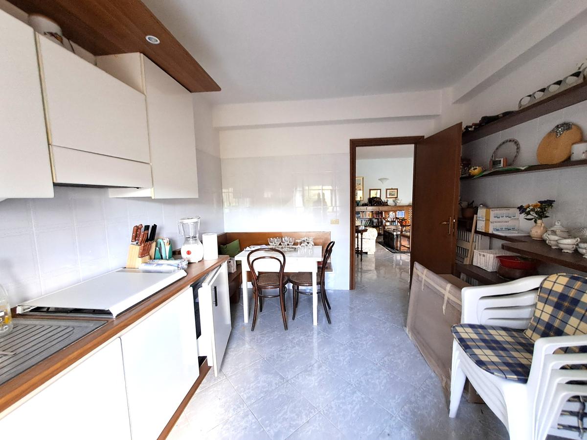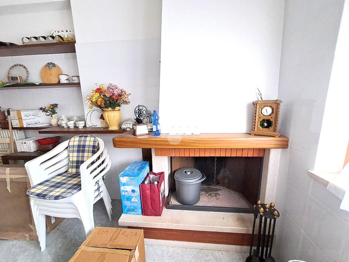 L’ingresso si apre su un grande salone luminoso con accesso diretto al balcone, seguito da una cucina abitabile dotata di camino.