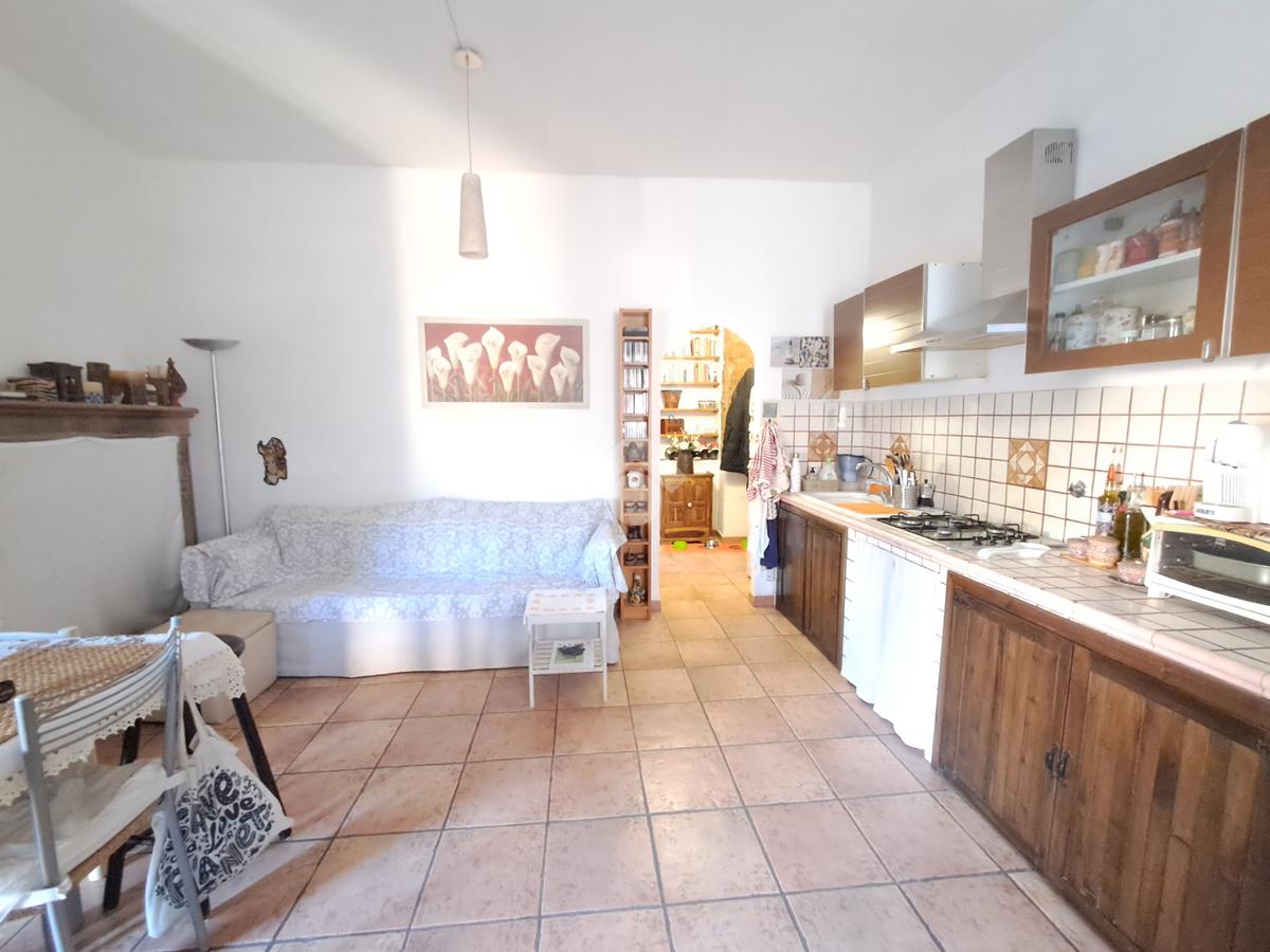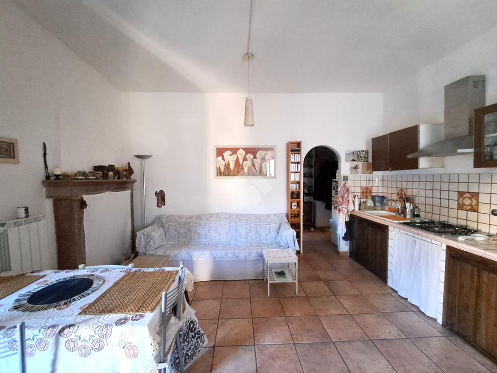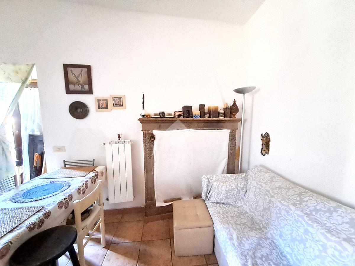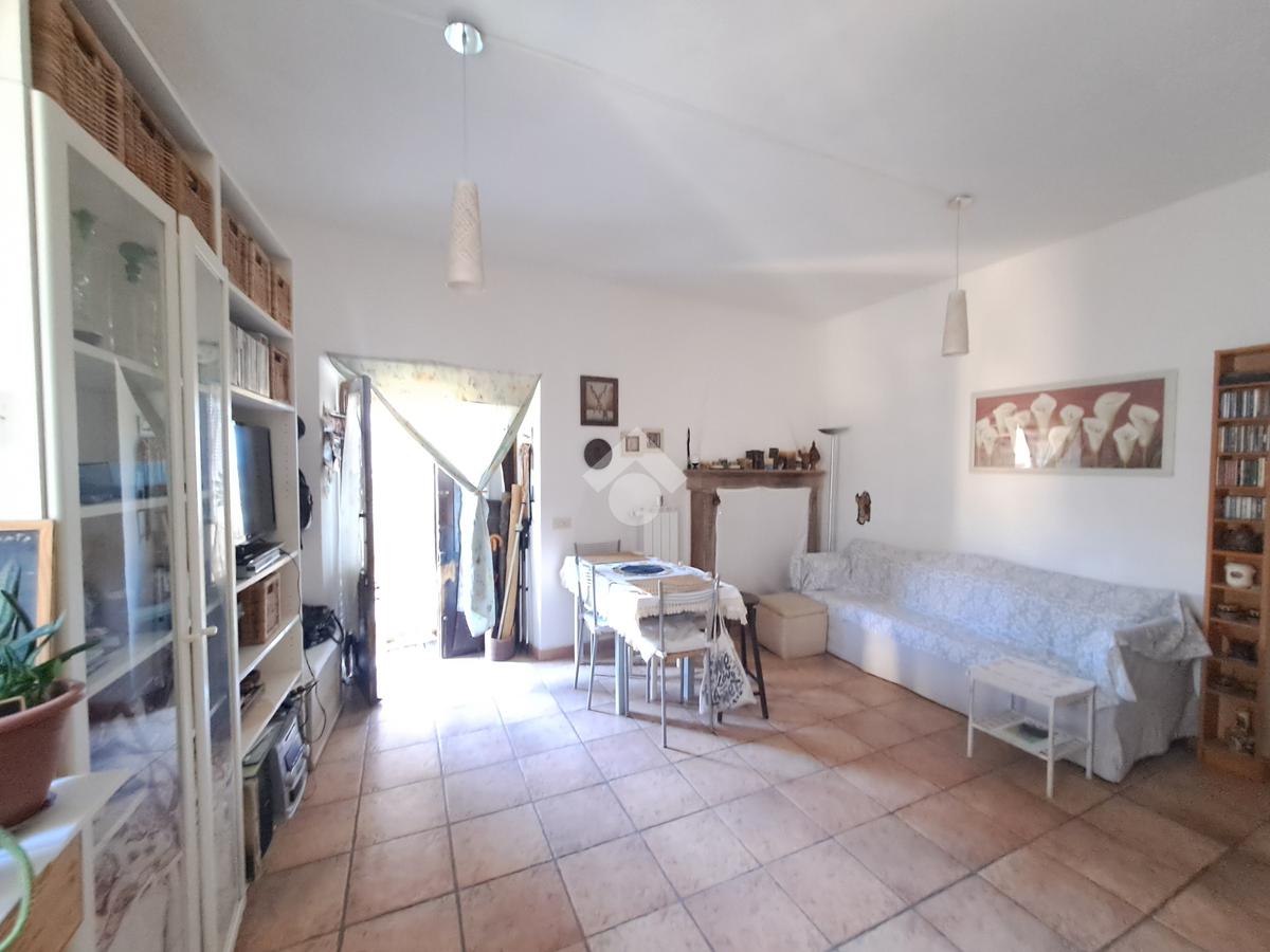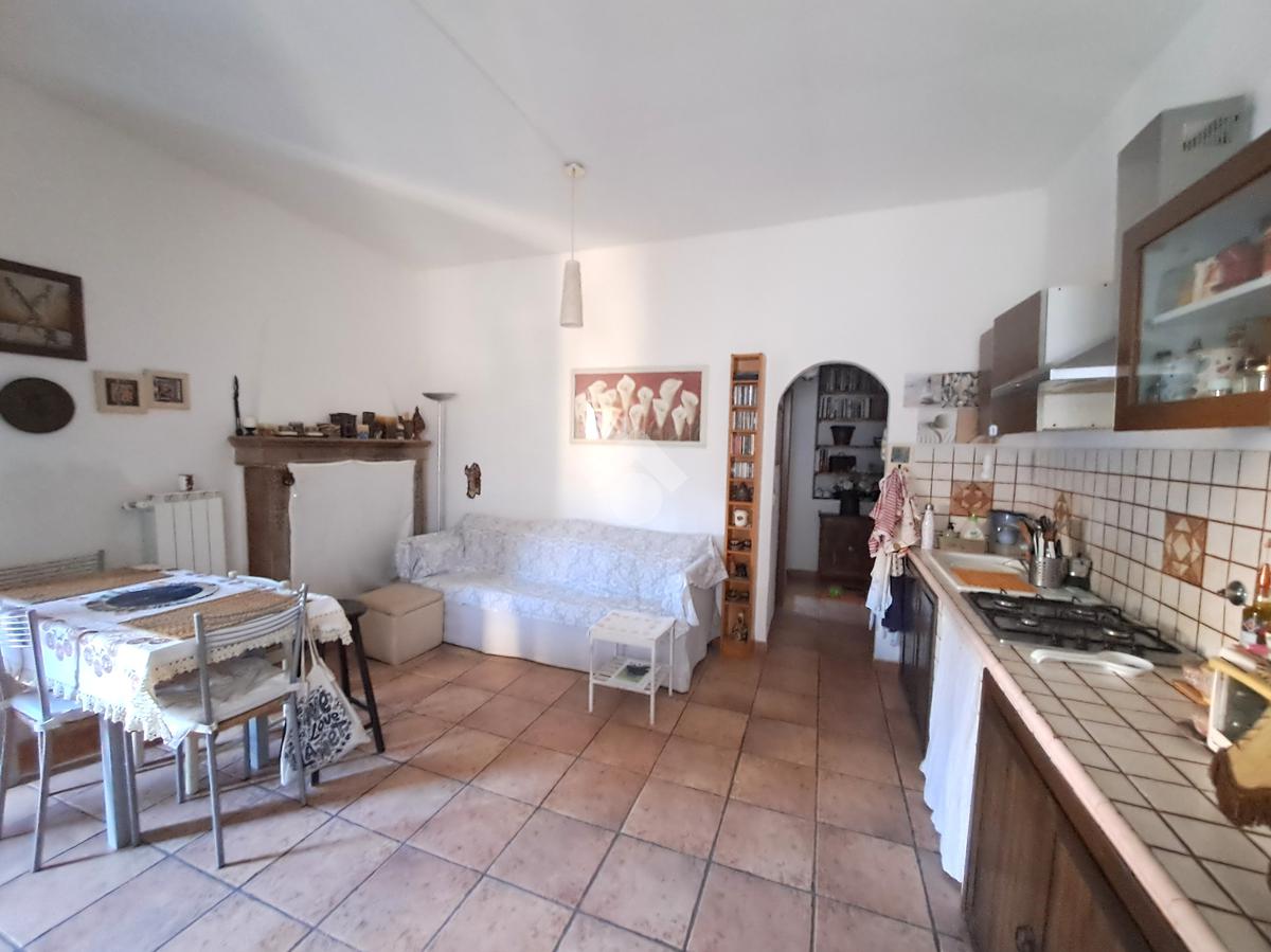 luminoso soggiorno con cucina in muratura a vista e camino, camera principale, un secondo ambiente polivalente (studio, cameretta o zona relax), ampio bagno con vasca.